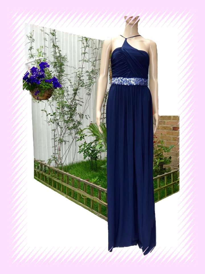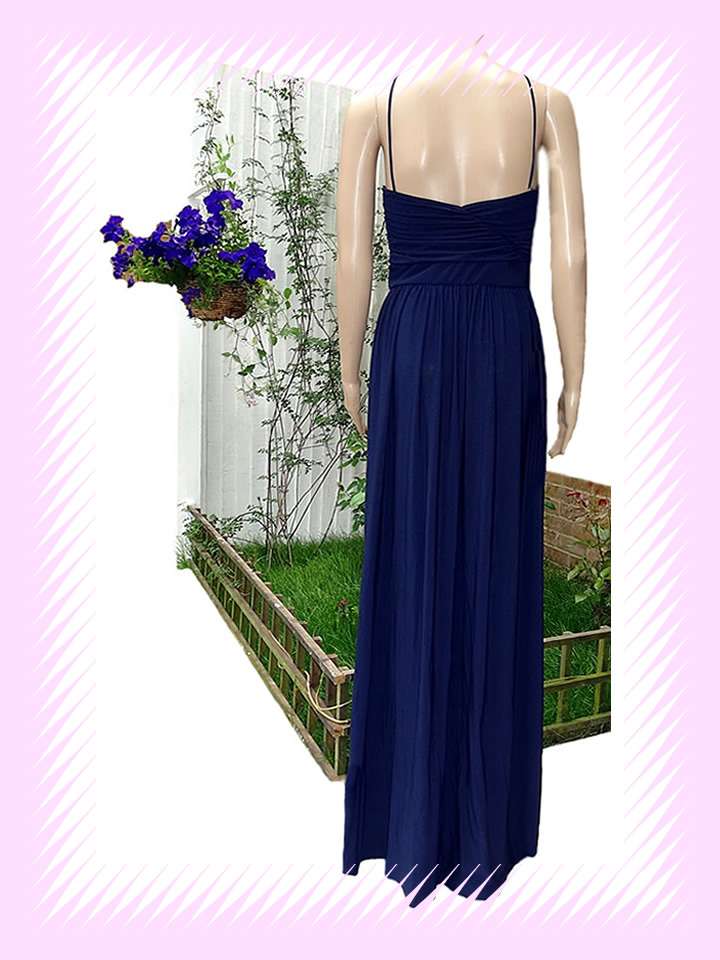 The royal navy colour slim-fitting dress elevated with distinct design details for a nuanced edit. An asymmetrical halter neckline. With long length endlessly flattering with side leg slip to get ready full attentions..Waist finishing line with mini artificial blue colour flower head.