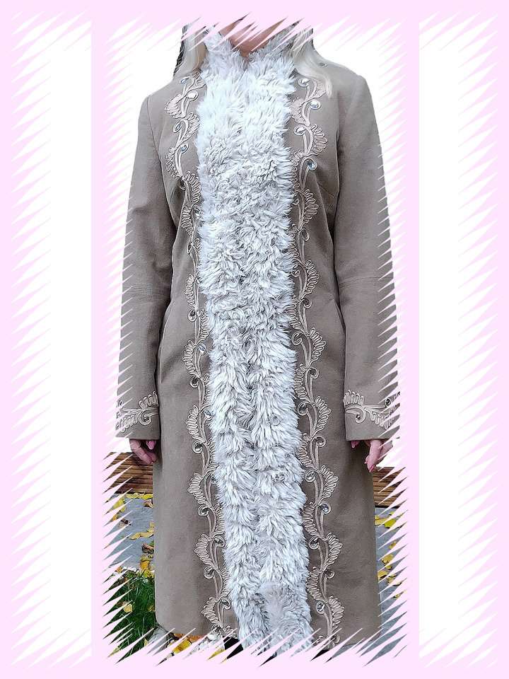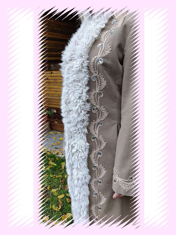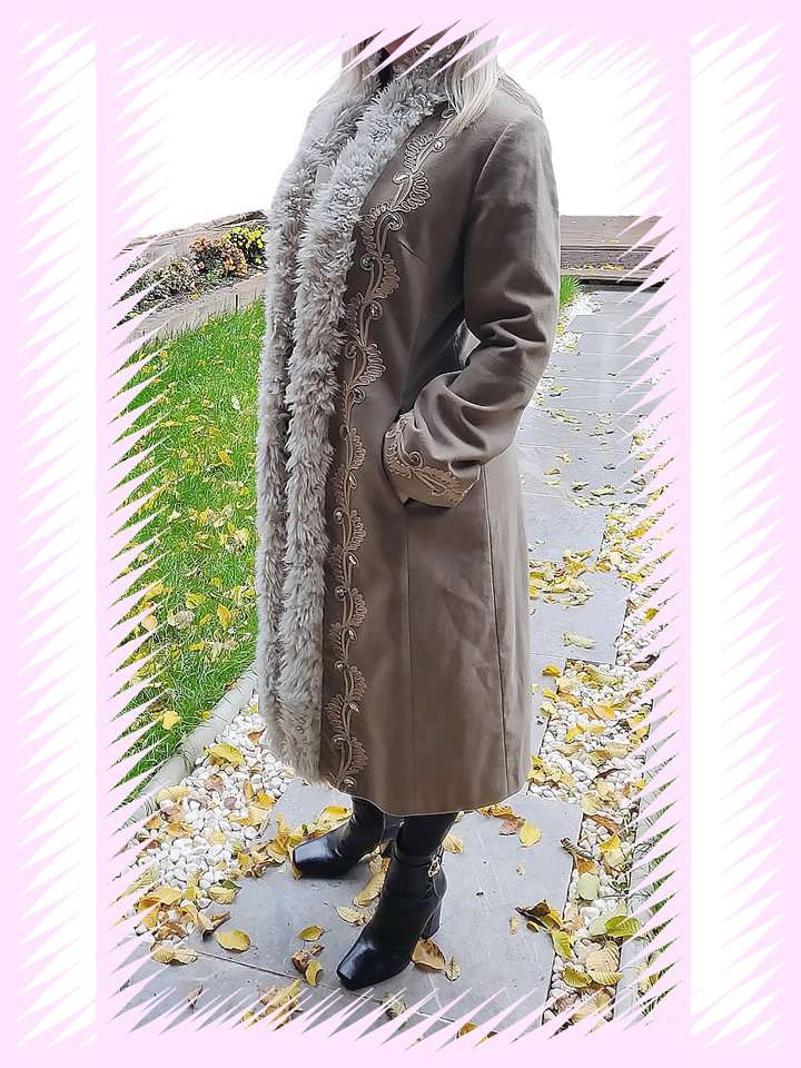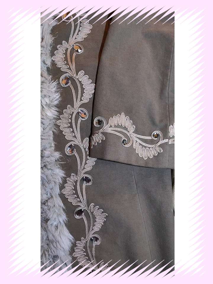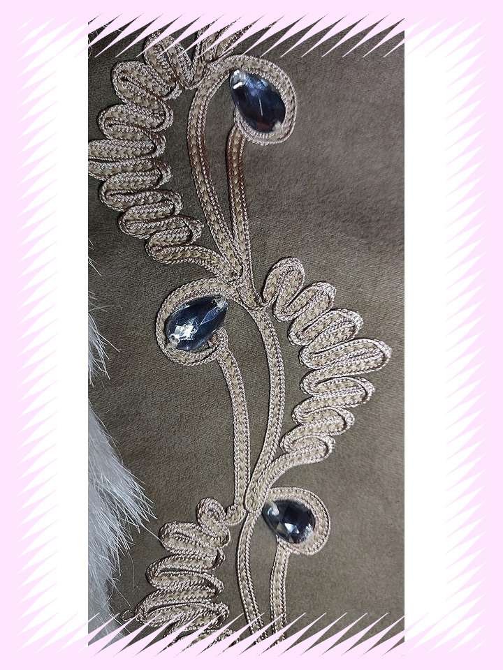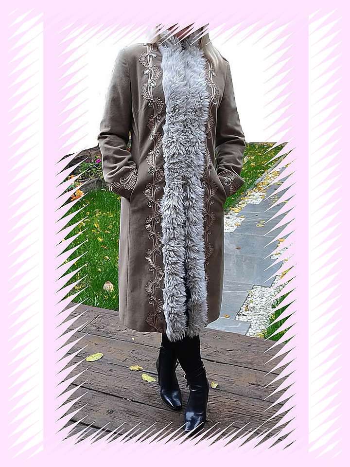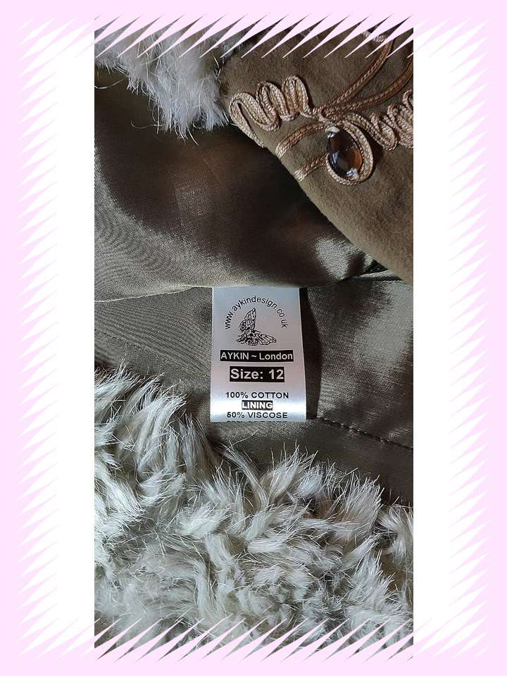 Aykin-London ~ Unique Special Tailoring Collections moleskin fur collar coat embellished with crystal rhinestone colour diamond ribbon and silk tape braid designed and decorated with Swarovski Crystal. It comes fully lined. With hook & bar through the front. Features side pockets.